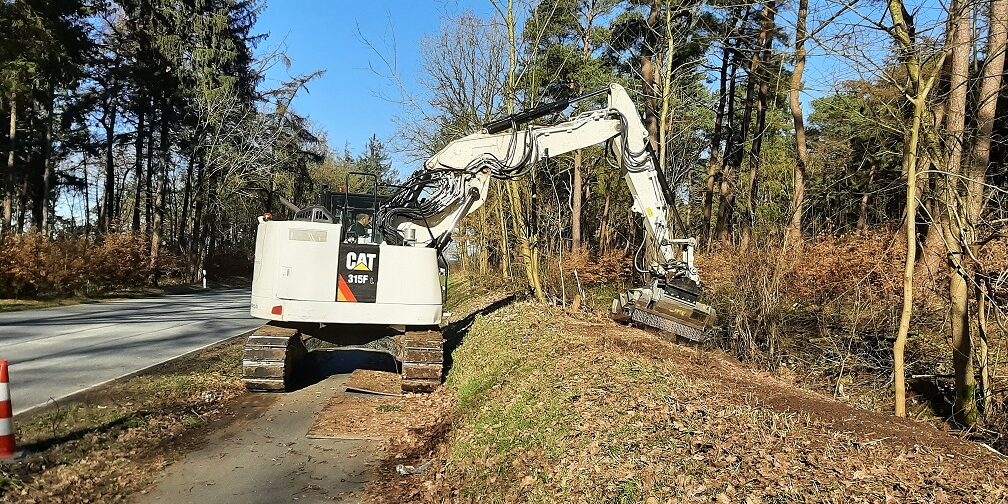 Der seit einigen Jahren abschnittsweise durchgeführte Waldumbau hin zu einem heimischen Laubwald hat nun den Außenrand erreicht. Seit vergangener Woche finden Gehölzarbeiten an den Waldrändern im Südteil der Jägersburger Heide statt, da dort in großen Teilen weiterhin Windschutz durch den westlich an die Straße grenzenden Forst gewährleistet bleibt. Angrenzend an den Radweg ist fast gänzlich die ausbreitungsstarke Gehölzart „Späte Traubenkirsche“ zu finden. Zunächst wird diese nun entnommen und der Waldrand durchforstet, um im nächsten Schritt heimische Sträucher und Bäume pflanzen zu können. Zur Schonung des angrenzenden Radwegs, des Walls und unterirdischer Versorgungsleitungen werden Gehölzstubben im Nahbereich nicht gerodet, sondern zunächst runter gemulcht und anschließend mit einer Stubbenfräse weiter bearbeitet. Für die Mulch- und Fräsarbeiten ist eine Bearbeitung von Seiten des Radwegs erforderlich. Die Durchforstung erfolgt durch die Claus Rodenberg Forst- und Landschaftspflege GmbH im Rahmen unseres TriKo-Projektes und wird finanziert aus Mitteln des Fonds „Mehr Natur für Dithmarschen“.